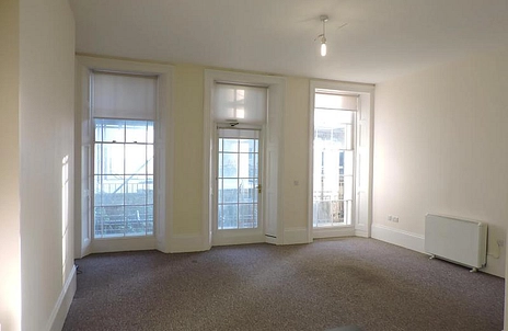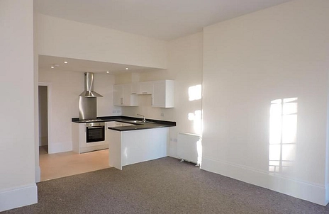 Entrance hall. Large south facing lounge/diner with three floor to ceiling sash windows and door to balcony and patio. Semi-open plan kitchen with modern white gloss units. Large utility room with space for further appliances and plumbing for washing machine. Two double bedrooms again with south facing floor to ceiling sash windows. Modern shower room and a further family bathroom.
