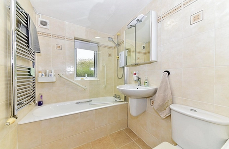 Bathroom: a stunning bathroom with shower over bath, toilet, basin, and heated towel rail.