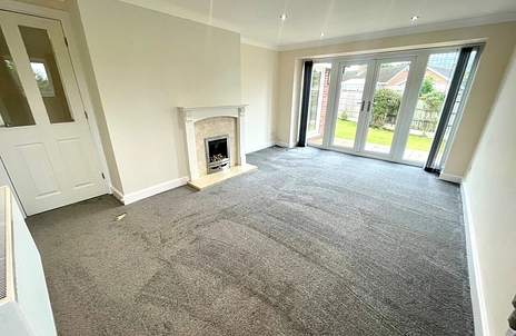 Spacious lounge with new decor and fitted fireplace with gas fire, UPVC double glazed patio doors leading onto the rear garden, UPVC double glazed window and recessed spotlights.