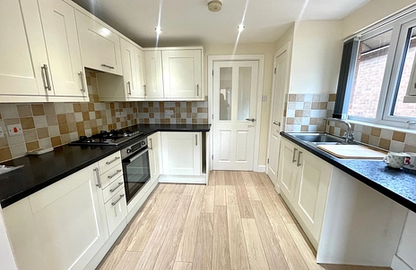 Modern fitted kitchen with oven, hob, fridge and freezer. UPVC double glazed window, laminate flooring. This room also benefits from an extended area, ideal space that can be used for dining.