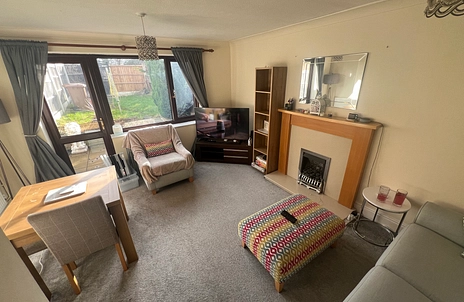 Outside. To the rear is a garden with lawn and decked area. Garage to the rear