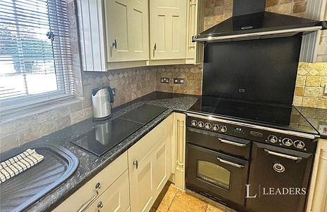KITCHEN/ BREAKFAST ROOM: Fitted with a range of eye level and base units, Rangemaster with extractor fan over. Dishwasher, breakfast bar. Inset spotlights, neutral stone floor tiles.