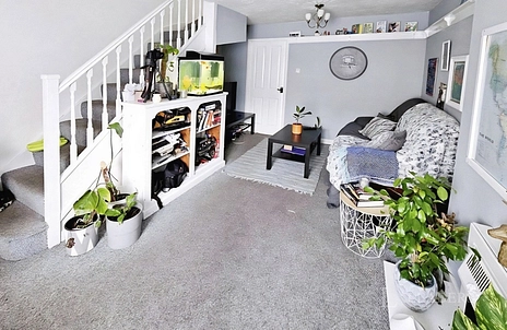 Carpeted with gas coal effect fire, under stairs cupboard, window to front.