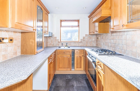 Kitchen -large kitchen with electric oven, gas hob and space for appliances.