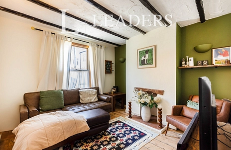 Sitting room with exposed floorboards and beams on the ceiling. Off the hallway there are stairs down to the basement that can be a used for storage or a study and has heating. The bathroom is on the first floor and has a shower over the bath. The main bedroom is a double with a king size bed and the second bedroom is a double with a single bed and a decorative fireplace.