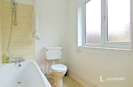 Bathroom - frosted window to the side aspect, tiled flooring and part tiled walls with a white three piece suite with shower over the bath.