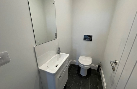 Ground floor cloakroom with w/c, hand wash basin with vanity unit and mirror, ceiling spotlights and vinyl flooring.