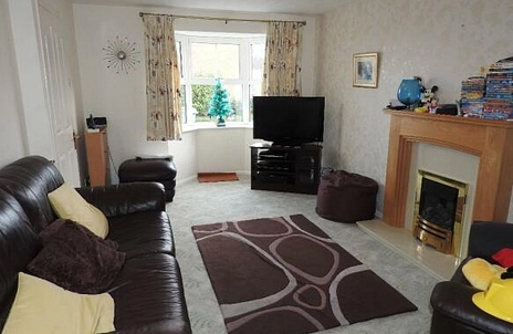 LOUNGE: Carpeted, neutral decor, good size room, bay window, fireplace, oak effect laminate flooring