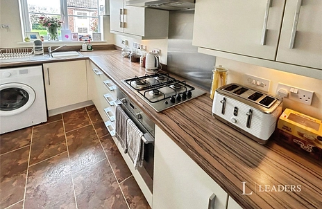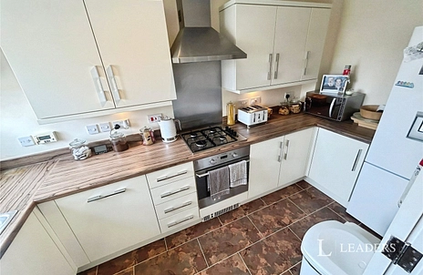 KITCHEN: Modern range of base and wall level units with work top over, tiled flooring, space for appliances..