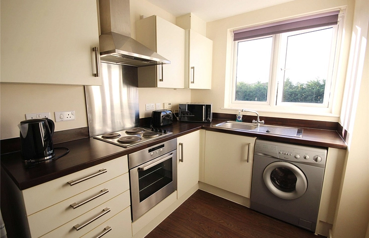 A well presented furnished modern first floor purpose built apartment with two double bedrooms and two bathrooms, situated within easy access to the M5 and GCHQ. The accommodation comprises entrance hall with telephone security intercom and doors to the living room, bathroom and both bedrooms. The living room has a large window to the side aspect, T.V. and telephone point, space for a dining table and is open to the kitchen. This is fitted with a range of matching wall and base level units with roll edge work surfaces over, one and a half bowl sink and drainer unit, four-ring electric hob with oven/grill under and extractor hood over, tiled splashbacks and washing machine and fridge freezer. Bedroom one is a good size with T.V./ telephone point and en-suite shower room. Bedroom two is also a double with a large window to the front aspect. The bathroom includes a panel bath with shower over, pedestal wash hand basin, low flush W.C and has tiled splashbacks and an extractor fan. To the front is allocated off road parking for one vehicle and a secure bike shed. The property is warmed by gas fired central heating and is double glazed throughout. Sorry no pets.EPC rating BCouncil Tax Band B