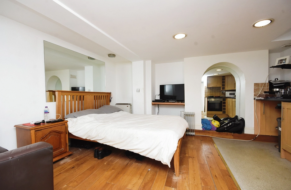 The property comprises of an organised entrance hallway, leading to the open plan living area, which is large enough to accommodate as a living area and bedroom space. The kitchen is open plan and is L shape in design to maximise the space on offer and features an abundance of counterspace and storage cupboards. The kitchen provides a breakfast bar as an ideal area for dining and working from home. The property maintains an airy and open-plan feel with an attractive archway that is mirrored to amplify the feeling of space. You will also find a low maintenance shower-room in the property with a large walk-in shower and an abundance of wall tiles to aid in low maintenance and easy cleaning.